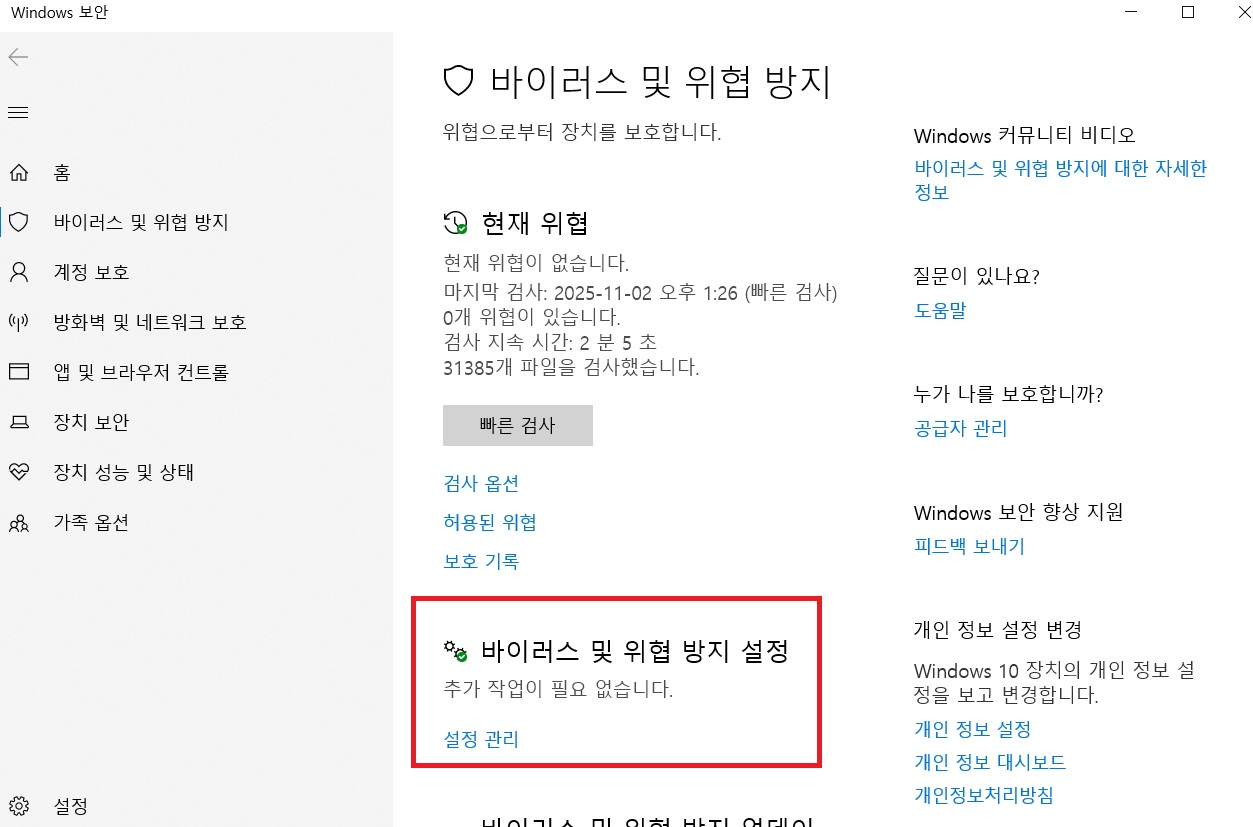 2. 왼쪽 메뉴에 '바이러스 및 위험방지' 클릭- 오른쪽에 뜨는 메뉴에서 '설정 관리'