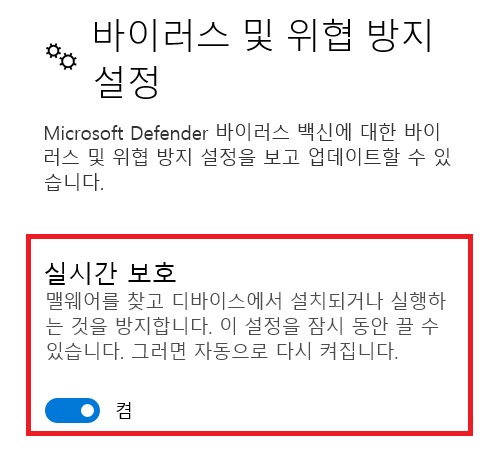 5. 이후 다시 실시간 보호 기능 켜두는 걸 권장