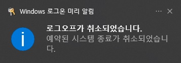 바로 오른쪽 아래 부분에 '로그오프가 취소되었습니다'라는 문구가 뜨면 자동종료가 취소되었다는 의미입니다.