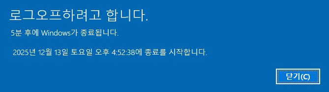 이때 '로그오프하려고 합니다'라는 문구가 뜨게 되는데 이건, 5분 후 윈도우 종료를 의미합니다.